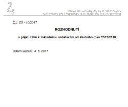 V pátek 7. 4. 2017 se v ZŠ Chyšky uskutečnil zápis dětí do první třídy. Zápis se nesl v duchu vodního prostředí a především žabiček Žbluňky a Kvaka. Děti poznávaly prostředí školy a seznámily se s paní učitelkou, která se na ně moc těší. Děti si nakreslily pohádkovou postavu, předvedly, jak krásně umí zavázat tkaničku, odříkat básničku, poznat písmenka, barvy, čísla a geometrické tvary. Domů si odnášely krásnou papírovou žabku a plno nových dojmů a zážitků. K zápisu se dostavilo společně s rodiči 19 dětí, z toho 4 s žádostí o odklad. Zápis připravila budoucí učitelka první třídy Mgr. Jaroslava Petáková.