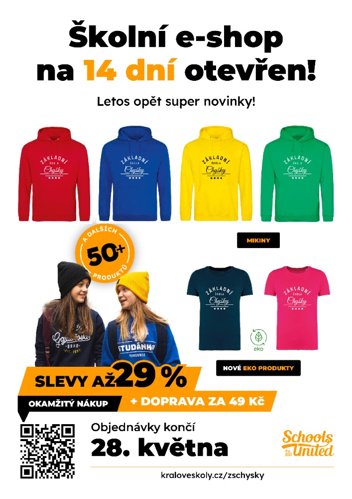 Nechali jsme si jako škola vytvořit svoji vlastní volnočasovou školní kolekci oblečení, jejíž náhled vidíte níže a kterou je možné si aktuálně pořídit na našem e-shopu zde: https://www.kraloveskoly.cz/zschysky/