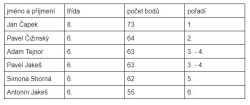 V úterý 9. dubna proběhlo na naší škole školní kolo Rybářské olympiády. Soutěž pořádá Střední rybářská škola Vodňany. Zúčastnili se žáci ze 6. a 8. třídy, řešili pět zajímavých úkolů. Poznávali druhy ryb, rozlišovali vodní živočichy na původní a nepůvodní. V testových otázkách prověřili svoje znalosti o pravidlech a zákonitostech, které platí ve vodním prostředí a okolo něj. V dalším úkolu popisovali části těla ryb a pátý úkol byl zaměřen na vodní rostliny. Za správné splnění všech úkolů mohli žáci nasbírat 100 bodů. Do soutěže se zapojilo celkem 746 žáků z 94 škol. V následující tabulce jsou výsledky školního kola na naší škole..