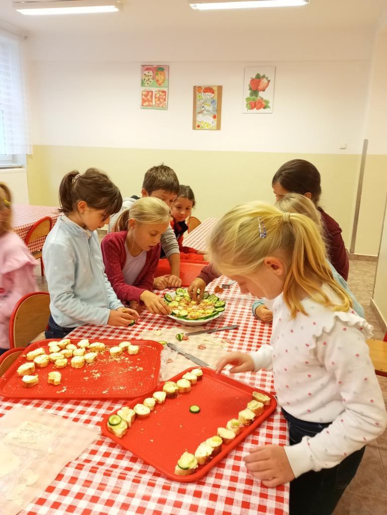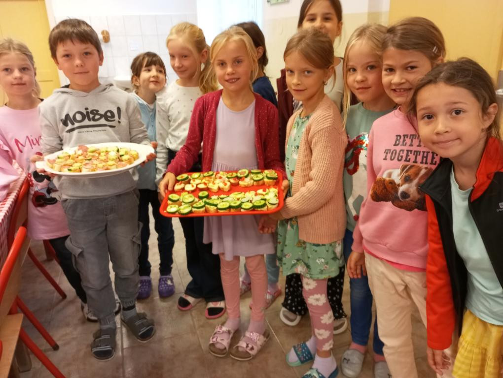 Ve škole jsme v jídelně vyráběli jednohubky, které jsme ozdobili pomocí vykrajovátek na perníčky. Jednohubky jsme dali ochutnat kuchařkám a nakonec je o svačinové přestávce snědli. Na nákup jsme měli 150 Kč. Nakoupili jsme za 86 Kč, paní prodavačka nám vrátila 64 Kč. Spočítali jsme si, že jsme nakoupili levně, zdravě a dobře.
