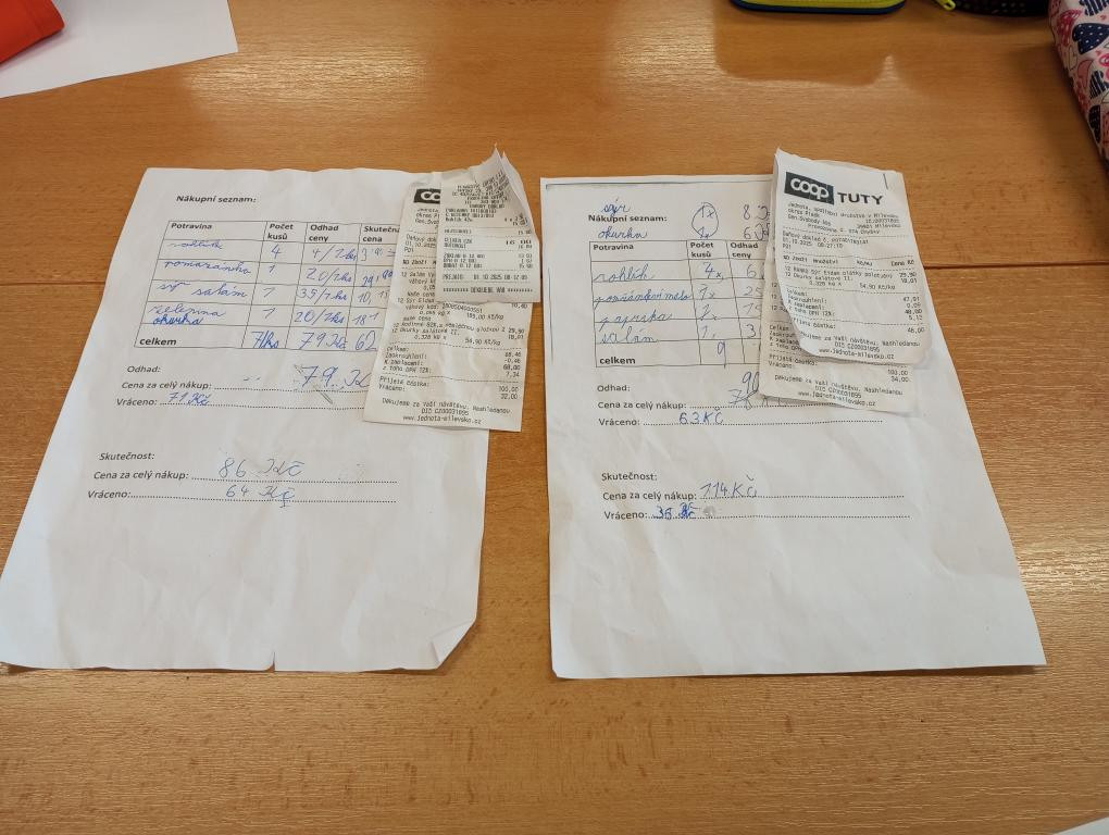Vojta spočítal, že nás jedna svačina vyšla přibližně na 8 Kč. Druhá skupina měla nákup dražší – 114 Kč, takže jejich cena za svačinu byla cca 12 Kč.