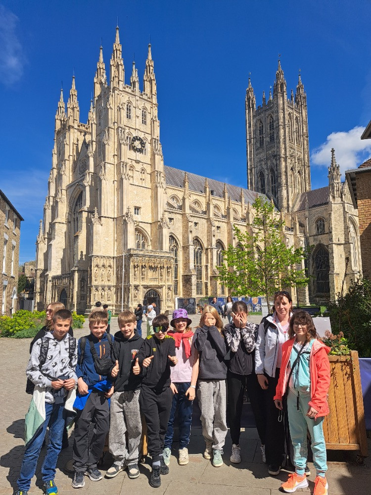 V pátek 17. dubna v 19 hodin se žáci 6. a 7. třídy vydali na dlouho očekávaný poznávací zájezd do Anglie. Po rozloučení s rodiči jsme nasedli do autobusu a vyrazili na noční cestu plnou očekávání a dobré nálady. I přes dlouhou cestu panovala v autobuse příjemná atmosféra a všichni se těšili na první zastávku. Tou byl Amsterdam, kam jsme dorazili brzy ráno. Po příjezdu jsme se vydali na procházku ulicemi města, kde nás zaujaly typické úzké a nahnuté domy podél kanálů. Žáci obdivovali místní architekturu a užívali si první zahraniční atmosféru. Navštívili jsme také interaktivní muzeum NEMO, které všechny nadchlo množstvím pokusů a zábavných aktivit. Navečer jsme se přesunuli na ubytování do Belgie, kde jsme si odpočinuli po náročném dni. Druhý den po snídani jsme pokračovali do francouzského přístavu Calais, odkud jsme trajektem přepluli přes Lamanšský průliv do Anglie. Plavba byla pro mnohé velkým zážitkem. Po příjezdu jsme zamířili do historického města Canterbury. Prošli jsme se jeho malebnými uličkami a navštívili krásnou katedrálu, která patří k nejvýznamnějším památkám Anglie. Večer si žáky vyzvedly hostitelské rodiny. Každý byl ubytován ve dvojicích nebo menších skupinkách, což jim umožnilo procvičit si angličtinu v běžné komunikaci. Žáci ochutnali domácí večeře a poznali každodenní život britských rodin.